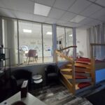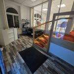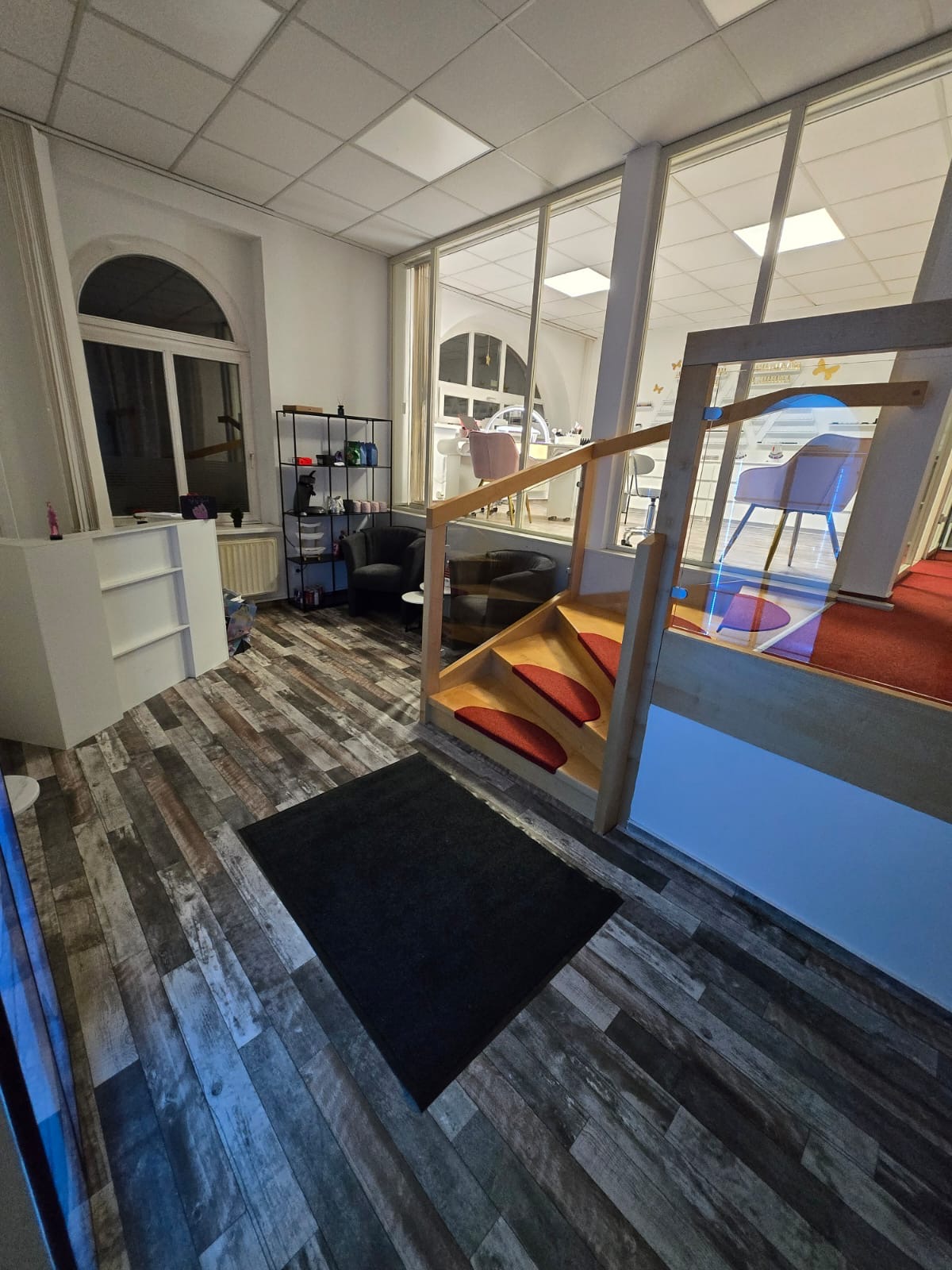 Dort stehen ein Fernseher, Spielsachen und Malutensilien bereit. Die Kinderecke ist durch ein Fenster vom Arbeitsbereich getrennt, sodass dein Kind sicher ist und nicht mit Gerüchen oder möglichen Stoffen in Kontakt kommt – gleichzeitig hast du immer Blickkontakt.